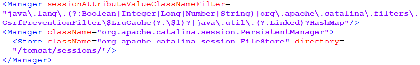 3.PersistenceManager中的sessionAttributeValueClassNameFilter被配置为“null”,或者过滤器不够严格,导致允许攻击者提供反序列化数据的对象